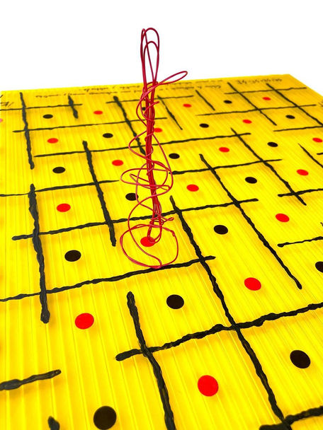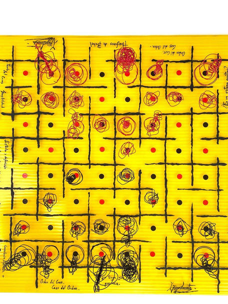 Un tablero de policarbonato plástico amarillo translúcido, con una reinterpretación del arcidriche o “damero” clásico, con multitud de inscripciones y apuntes reflexivos sobre la obra.